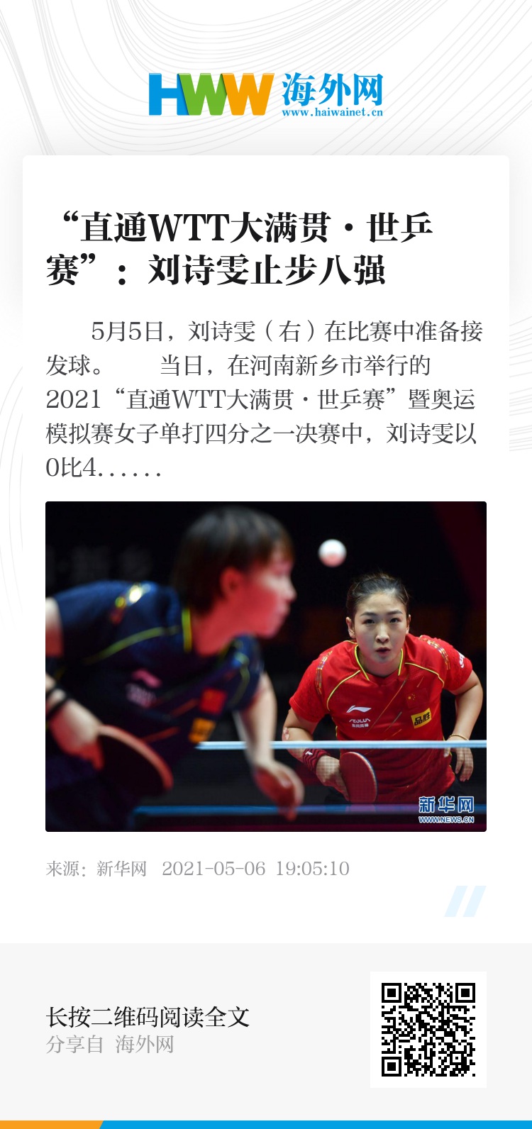 当日,在河南新乡市举行的2021“直通WTT大满贯·世乒赛”暨奥运模拟赛女子单打四分之一决赛中,刘诗雯以0比4不敌朱雨玲,止步八强。