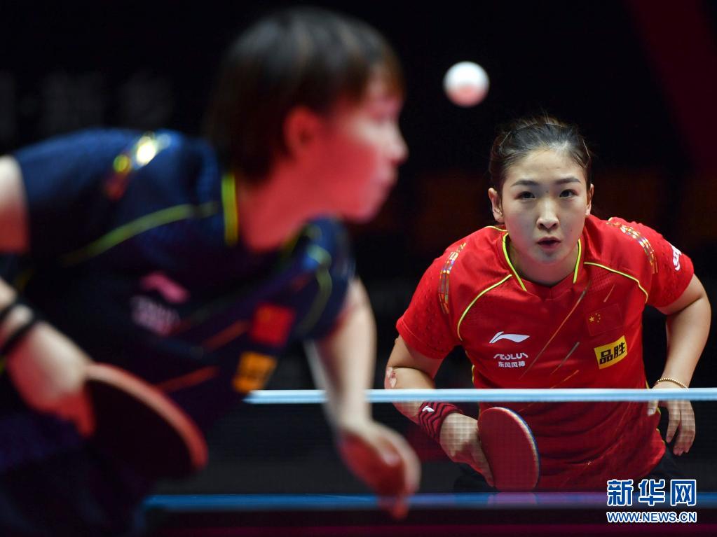 5月5日,刘诗雯(右)在比赛中准备接发球。