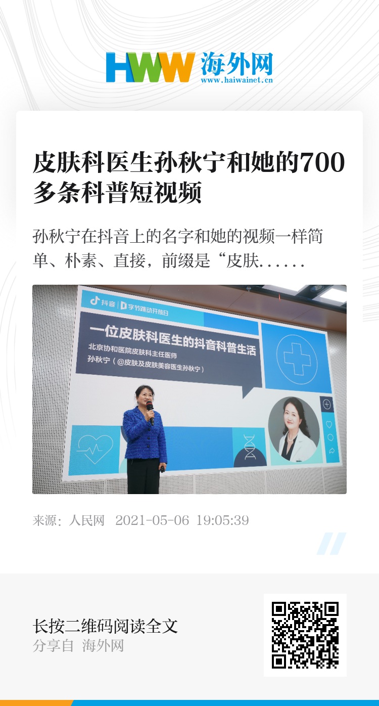 2020年3月11日,孙秋宁入驻抖音后,在第一条视频中简述了自己的从业经历,在评论区中,几个医生同行留言:“孙老师是协和皮肤科顶级专家,广大网友有福了。”自那以后,孙秋宁共发布了700多条科普视频,内容包括荨麻疹如何根治、汗疱疹如何处理、如何正确涂抹护肤品……她的帐号如同一本应对皮肤问题的百科全书,网友有任何皮肤方面的困扰,都能在里面找到答案。