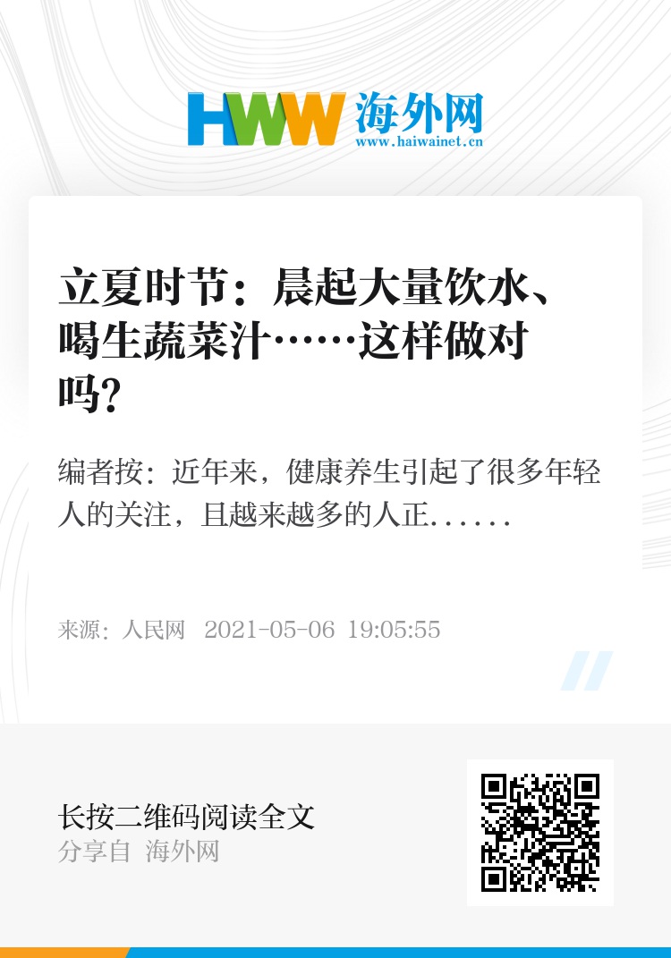 立夏后,气温升高,体液消耗增加,晨起往往会出现口渴现象,很多人习惯饮水,补充水分。然而从养生角度看,短时间饮用大量白开水,需要消耗人体大量阳气,而晨起人体阳气刚刚萌动,此时阳气过度消耗会使一天工作效力减退、疲乏困倦。