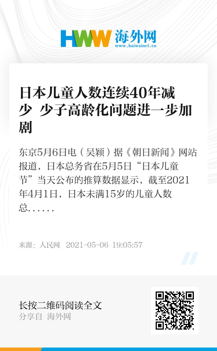 人民网东京5月6日电(吴颖)据《朝日新闻》网站报道,日本总务省在5月5日“日本儿童节”当天公布的推算数据显示,截至2021年4月1日,日本未满15岁的儿童人数总计为1493万人,比去年减少了19万人,连续40年呈下降趋势。