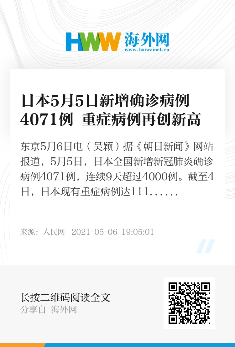 人民网东京5月6日电(吴颖)据《朝日新闻》网站报道,5月5日,日本全国新增新冠肺炎确诊病例4071例,连续9天超过4000例。截至4日,日本现有重症病例达1114例,超过2日的1084例,再次刷新历史最高纪录。5日,日本新增死亡病例60例,其中大阪府新增25例,兵库县新增13例。