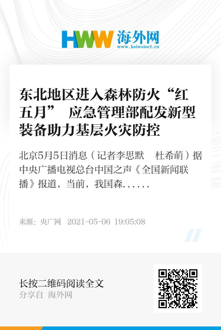 央广网北京5月5日消息(记者李思默 杜希萌)据中央广播电视总台中国之声《全国新闻联播》报道,当前,我国森林草原防火灭火工作重心已由南向北过渡,特别是东北地区已经进入森林防火的“红五月”,火灾呈易发高发态势。应急管理部森林消防局日前根据任务形势变化,及时向基层一线队伍配发大型新型装备,指导各地队伍严密布控,全力防范火灾发生。