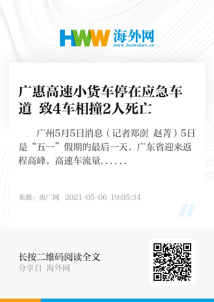5日4时40分许,在广惠高速罗峰隧道出口约2公里处,一辆小货车停在应急车道,被后方一辆面包车碰撞后顶入行车道,与途经的2辆小车发生碰撞,造成4车相撞的交通事故。事故导致1人当场死亡,1人抢救无效死亡,6人受伤。经了解,当时小货车司机想“解手”,便把车停在应急车道。目前,事故原因正在进一步查明。