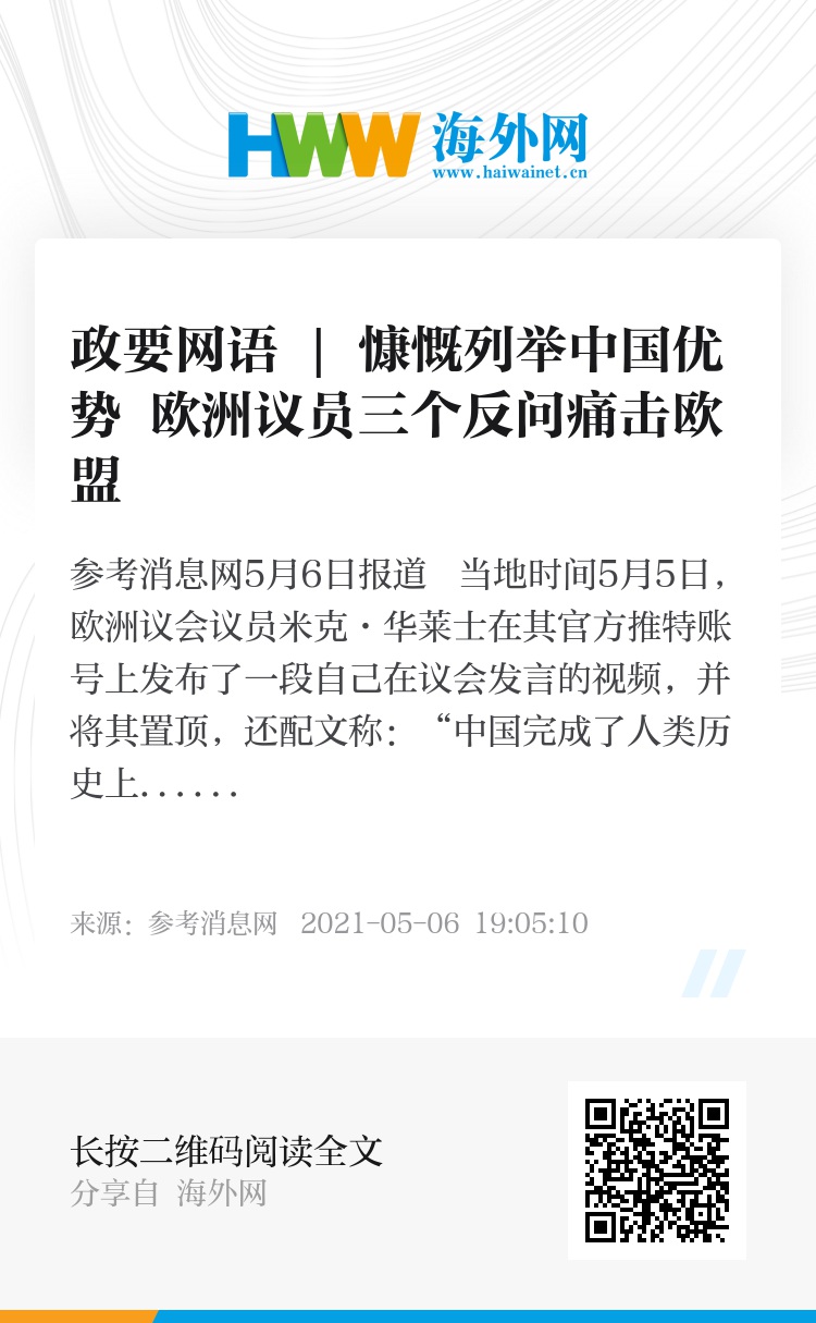 参考消息网5月6日报道 当地时间5月5日,欧洲议会议员米克·华莱士在其官方推特账号上发布了一段自己在议会发言的视频,并将其置顶,还配文称:“中国完成了人类历史上最伟大的减贫项目,而西方无家可归者的数量达到了创纪录的水平。在过去的40年里,中国没有轰炸任何国家,也没有对任何国家实施制裁,为什么欧盟允许美国把我们拖入与中国的对抗中?”(China has completed greatest poverty reduction programme in human history, while Homelessness in the West is at record levels. In last 40 years China bombed nobody or isn't Sanctioning any countries to death - Why is EU allowing US to drag us into confrontation with China..?)