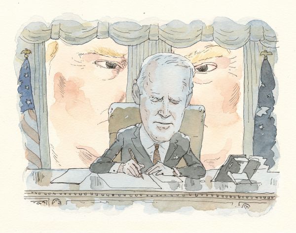 拜登在白宫办公,特朗普在窗外窥视。(漫画原载美国《政治报》网站)
