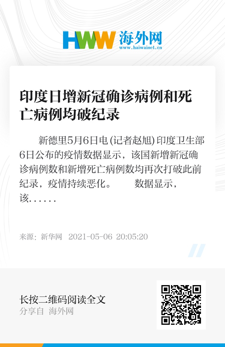 新华社新德里5月6日电(记者赵旭)印度卫生部6日公布的疫情数据显示,该国新增新冠确诊病例数和新增死亡病例数均再次打破此前纪录,疫情持续恶化。