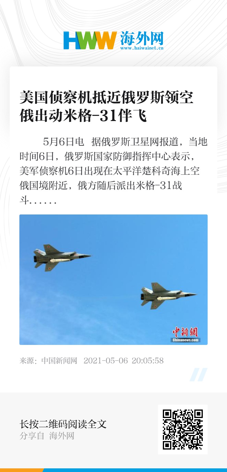 中新网5月6日电 据俄罗斯卫星网报道,当地时间6日,俄罗斯国家防御指挥中心表示,美军侦察机6日出现在太平洋楚科奇海上空俄国境附近,俄方随后派出米格-31战斗机升空,并对美军侦察机进行了伴飞。