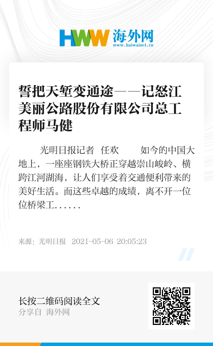 一分耕耘,一分收获,马健将自己的青春化作了高山峡谷间的一座座各式各样的桥梁,它们连通了道路,连通了城市,连通了群众,也连通了人心。