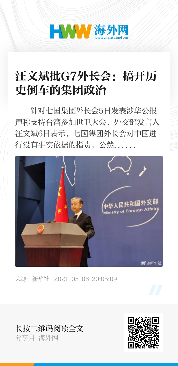 针对七国集团外长会5日发表涉华公报声称支持台湾参加世卫大会,外交部发言人汪文斌6日表示,七国集团外长会对中国进行没有事实依据的指责,公然插手中国的内部事务,搞开历史倒车的集团政治,这是对中国主权的粗暴干涉,是对国际关系准则的肆意破坏,违背和平、发展、合作、共赢的时代潮流,中方对此予以强烈谴责。七国集团当中包括疫情最严重和医疗技术最先进的国家,理应聚焦国际抗疫合作,促进疫苗公平分配,而不是只顾自身囤积疫苗,对帮助其他国家只做些不疼不痒的表态,更不应以高人一等的心态对他国横加指责、干涉,破坏国际抗疫合作这个当前的头等大事。“我们敦促有关国家正视自身存在的问题,纠正在抗疫问题上自私自利的行为,停止泛化国家安全概念的错误行径。无视国际关系基本准则,制造各种借口干涉中国内政、损害中国主权、抹黑中国形象的企图绝不会得逞。”