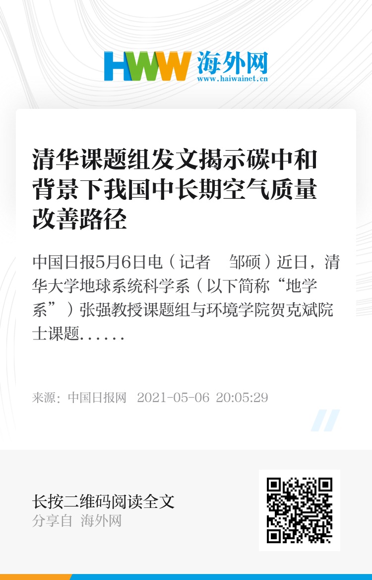 中国日报5月6日电(记者 邹硕)近日,清华大学地球系统科学系(以下简称“地学系”)张强教授课题组与环境学院贺克斌院士课题组合作在《国家科学评论》(National Science Review)在线发表题为《碳中和背景下中国2015-2060年PM2.5空气质量改善路径》的论文,首次定量揭示了碳达峰与碳中和目标下中国及重点区域2015-2060年的空气质量持续改善路径,指出了实现碳中和目标对我国未来空气质量根本改善的决定性作用。