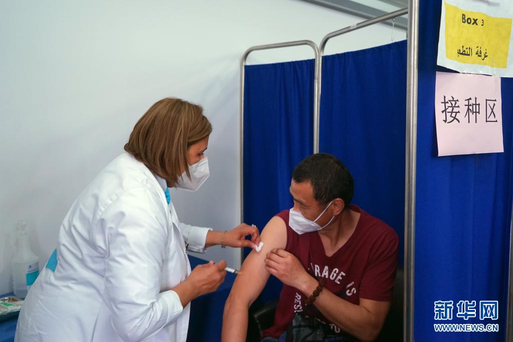 5月5日,一名身处突尼斯的中国公民(右)在突首都突尼斯市一处接种点接种新冠疫苗。新华社发