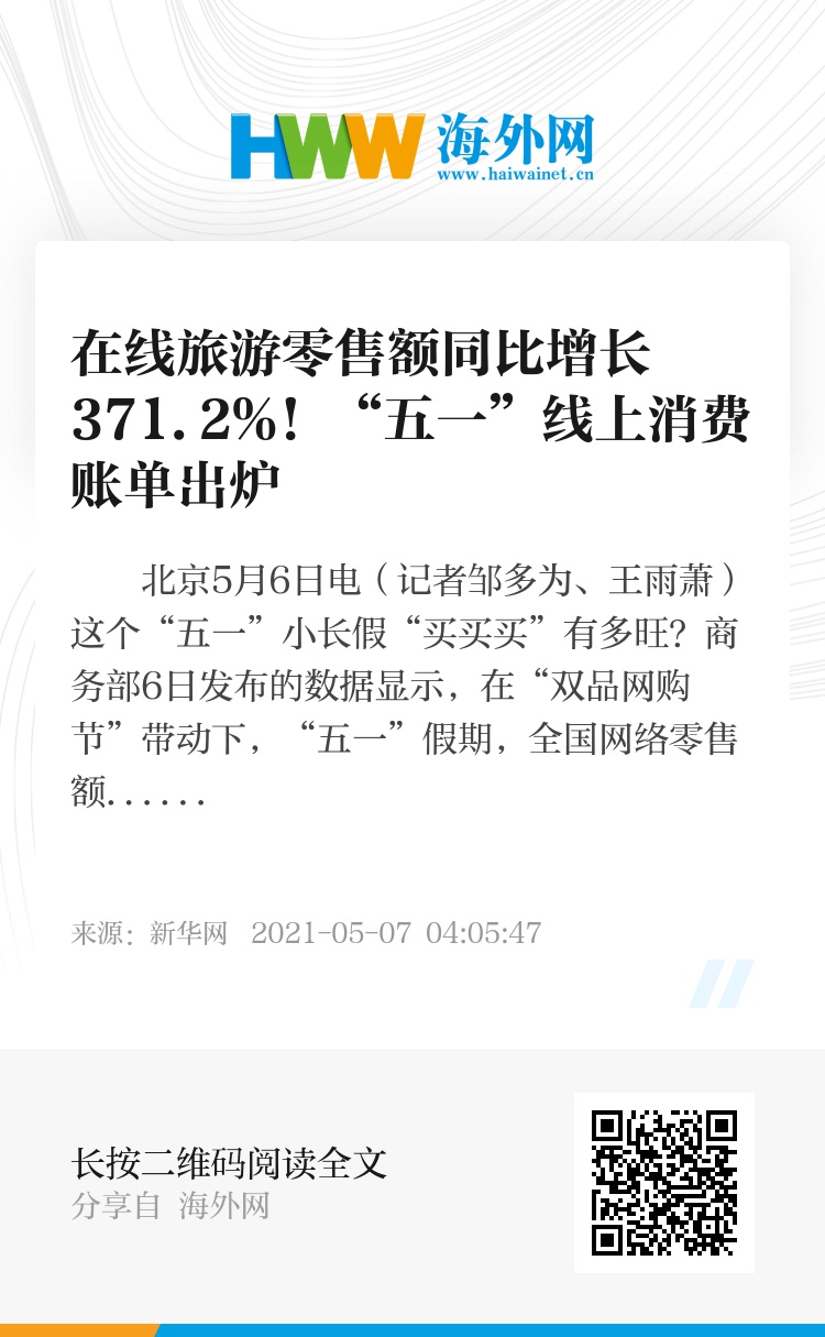 新华社北京5月6日电(记者邹多为、王雨萧)这个“五一”小长假“买买买”有多旺?商务部6日发布的数据显示,在“双品网购节”带动下,“五一”假期,全国网络零售额同比增长29.2%,在线旅游零售额更是同比大幅增长371.2%。