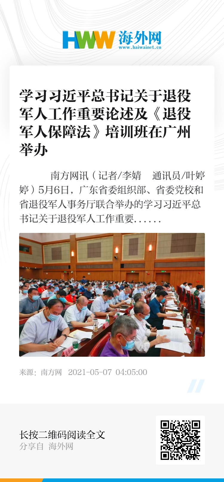 南方网讯(记者/李婧 通讯员/叶婷婷)5月6日,广东省委组织部、省委党校和省退役军人事务厅联合举办的学习习近平总书记关于退役军人工作重要论述及《退役军人保障法》培训班在广州开班。