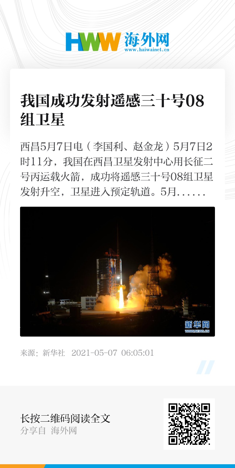 新华社西昌5月7日电(李国利、赵金龙)5月7日2时11分,我国在西昌卫星发射中心用长征二号丙运载火箭,成功将遥感三十号08组卫星发射升空,卫星进入预定轨道。