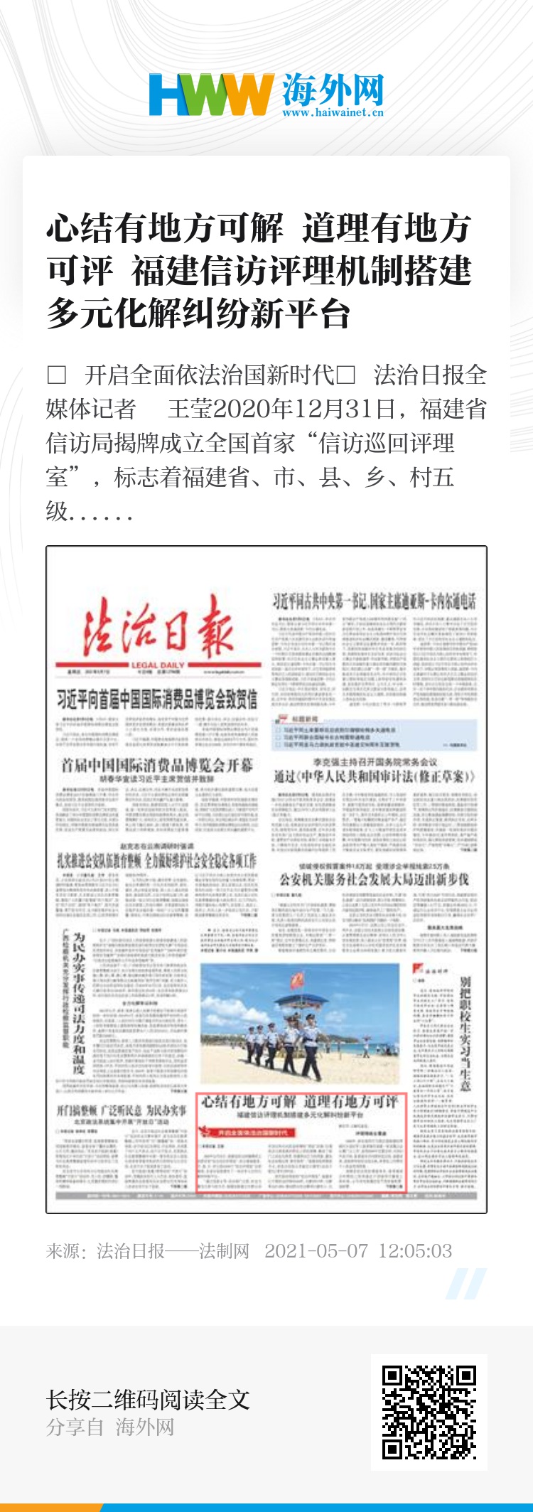 “通过党政主导、信访部门主抓、社会力量充分参与的方式,福建创新建立对群众诉求表达和合法权益保障的‘兜底’机制,打通信访与其他救济路径之间的屏障,解决了部门之间各负其责、衔接联动乏力的现象,避免社会治理出现‘真空地带’。”福建省政府副秘书长、省信访局局长李斌近日接受《法治日报》记者采访时说。