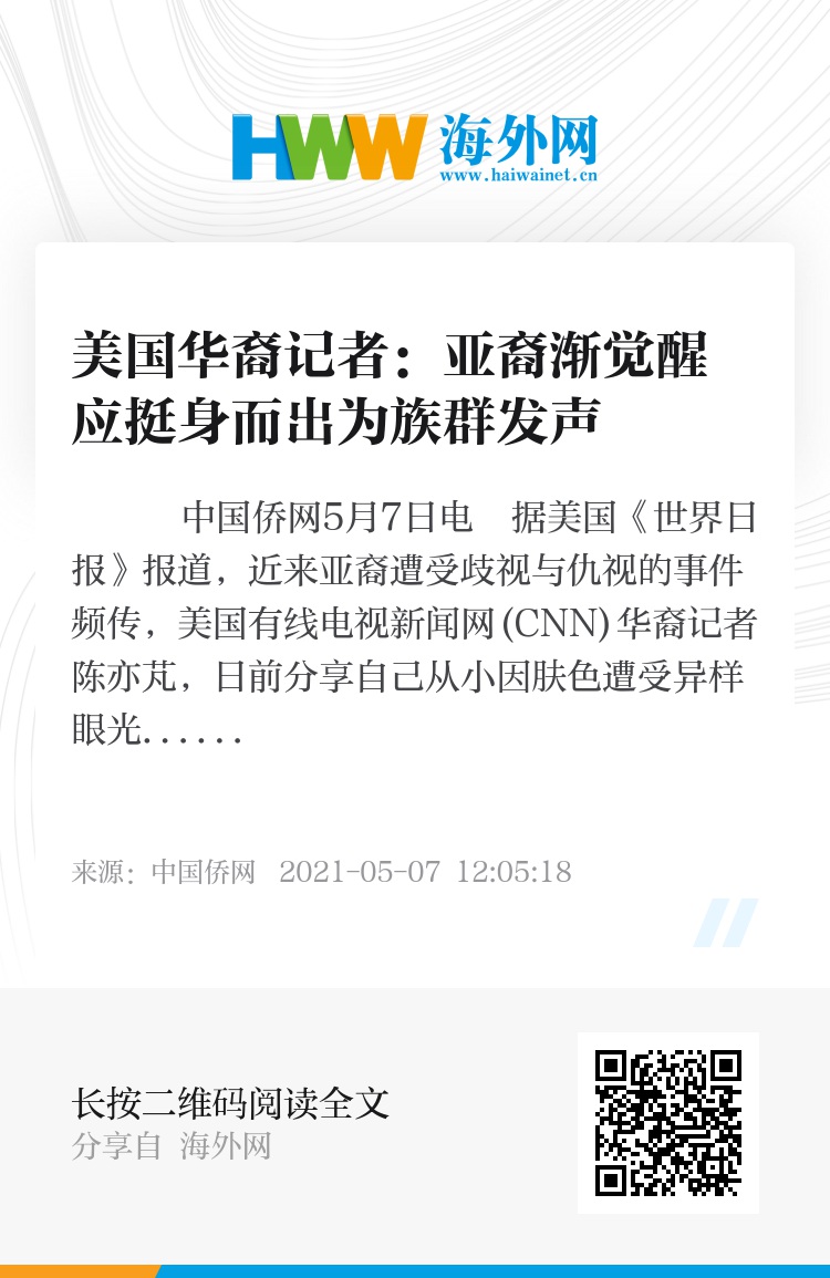中国侨网5月7日电 据美国《世界日报》报道,近来亚裔遭受歧视与仇视的事件频传,美国有线电视新闻网(CNN)华裔记者陈亦芃,日前分享自己从小因肤色遭受异样眼光、差别待遇的经历,讲述亚裔如何在此次疫情与多波攻击中慢慢觉醒,为自己的族群发声。
