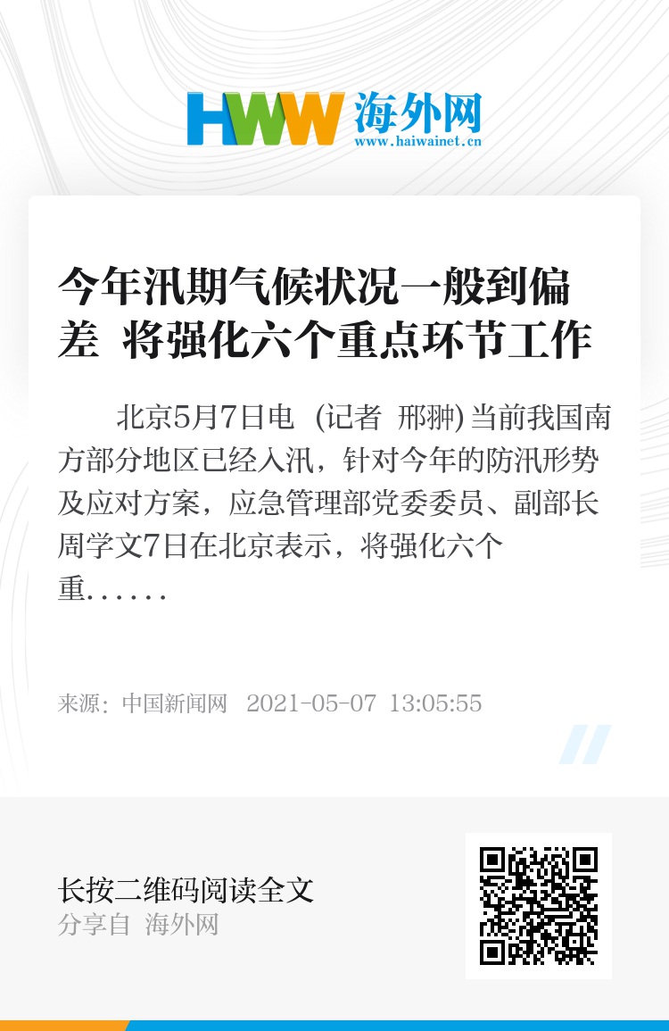 中新网北京5月7日电 (记者 邢翀)当前我国南方部分地区已经入汛,针对今年的防汛形势及应对方案,应急管理部党委委员、副部长周学文7日在北京表示,将强化六个重点环节的工作。