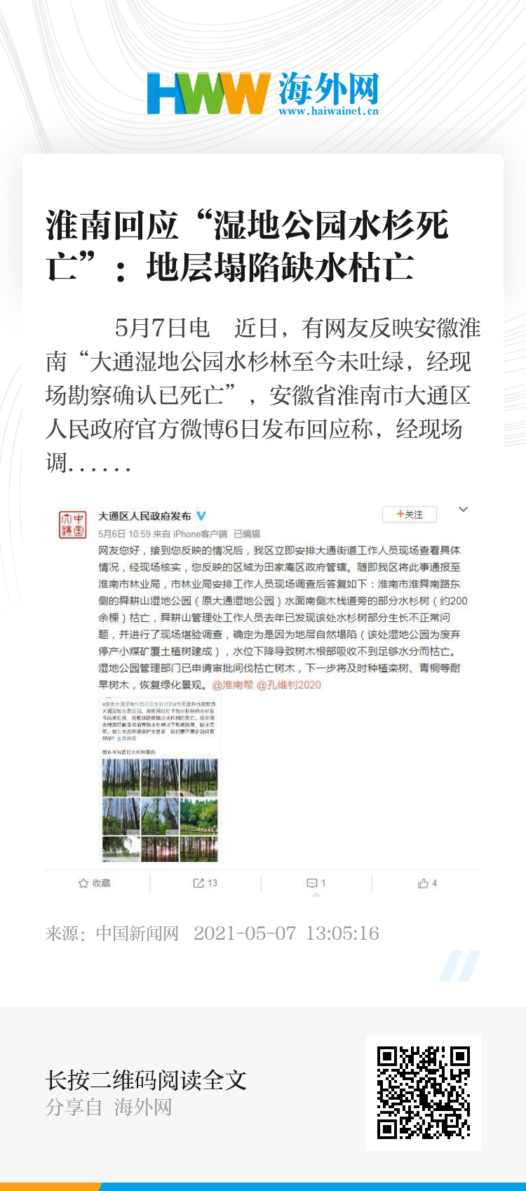 中新网5月7日电 近日,有网友反映安徽淮南“大通湿地公园水杉林至今未吐绿,经现场勘察确认已死亡”,安徽省淮南市大通区人民政府官方微博6日发布回应称,经现场调查,淮南市淮舜南路东侧的舜耕山湿地公园(原大通湿地公园)水面南侧木栈道旁的部分水杉树(约200余棵)枯亡,舜耕山管理处工作人员去年已发现该处水杉树部分生长不正常问题,并进行了现场堪验调查,确定为是因为地层自然塌陷(该处湿地公园为废弃停产小煤矿覆土植树建成),水位下降导致树木根部吸收不到足够水分而枯亡。