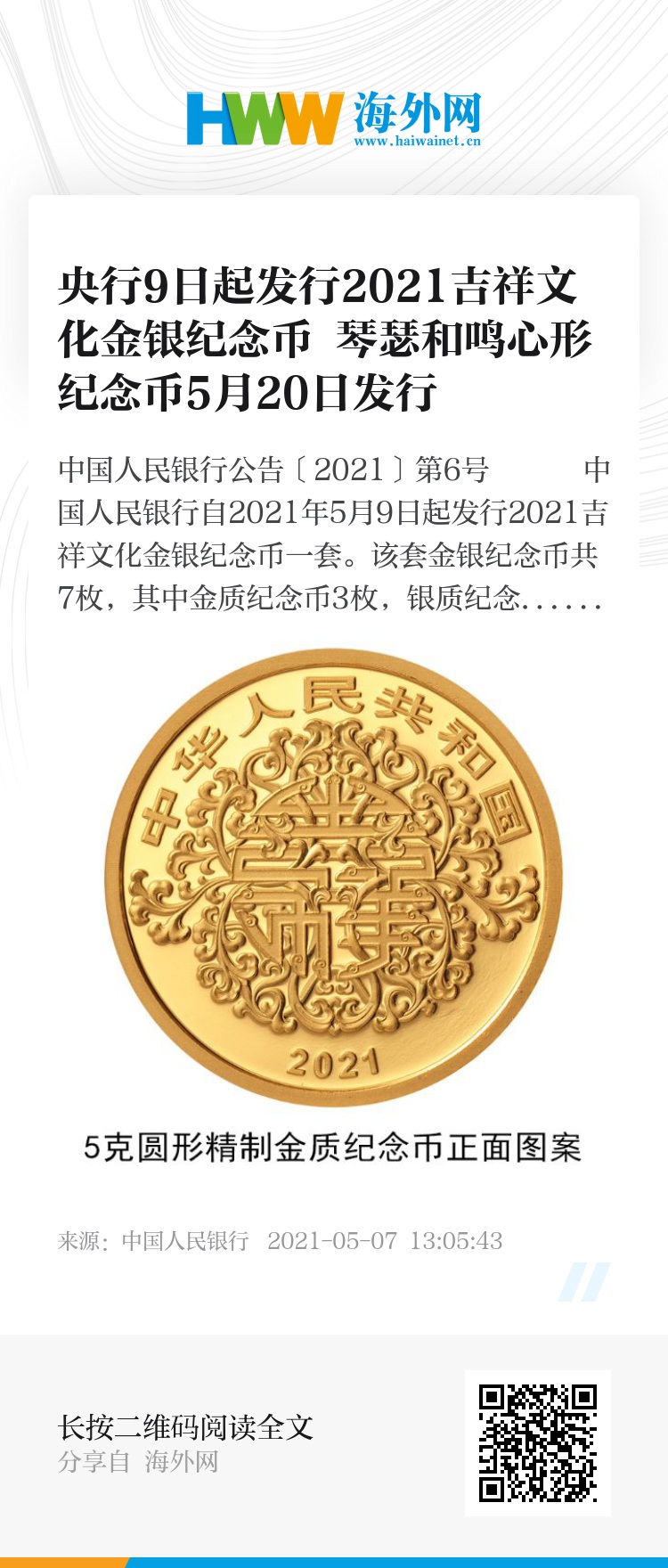 中国人民银行自2021年5月9日起发行2021吉祥文化金银纪念币一套。该套金银纪念币共7枚,其中金质纪念币3枚,银质纪念币4枚,均为中华人民共和国法定货币。