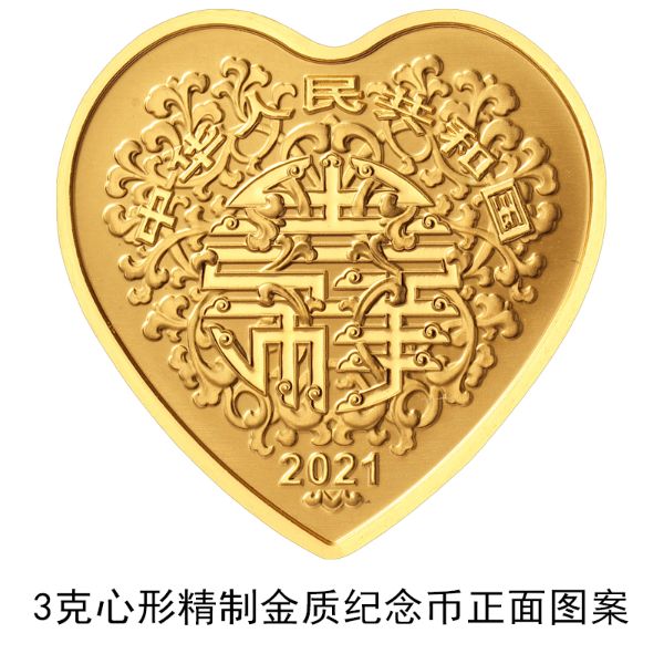 3克心形金质纪念币为精制币,含纯金3克,外接正方形边长18毫米,面额50元,成色99.9%,最大发行量20000枚。