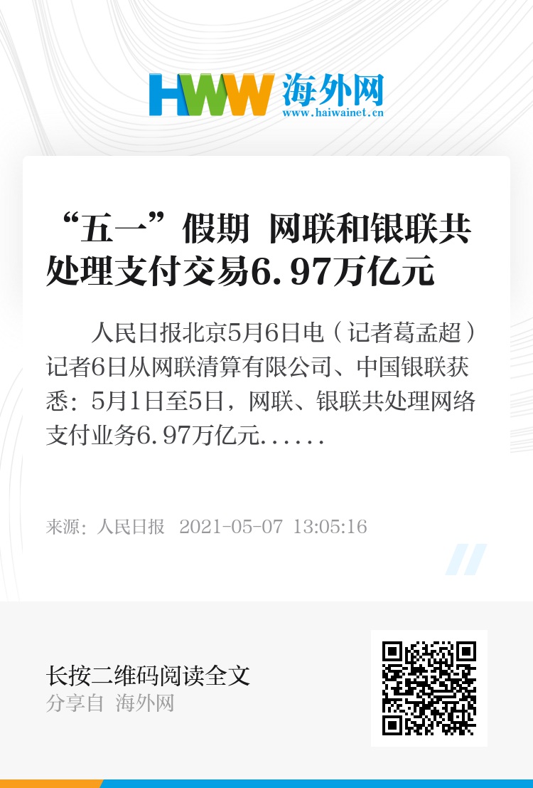 人民日报北京5月6日电(记者葛孟超)记者6日从网联清算有限公司、中国银联获悉:5月1日至5日,网联、银联共处理网络支付业务6.97万亿元,创同期新高。