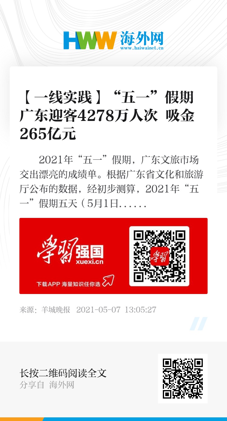 广东省文化和旅游厅相关负责人介绍,2021年“五一”假期,广东地区天气晴雨相间,气温舒适宜人,民众出游热情和消费信心显著提升。全省文化旅游市场进一步复苏回暖,运行平稳有序。
