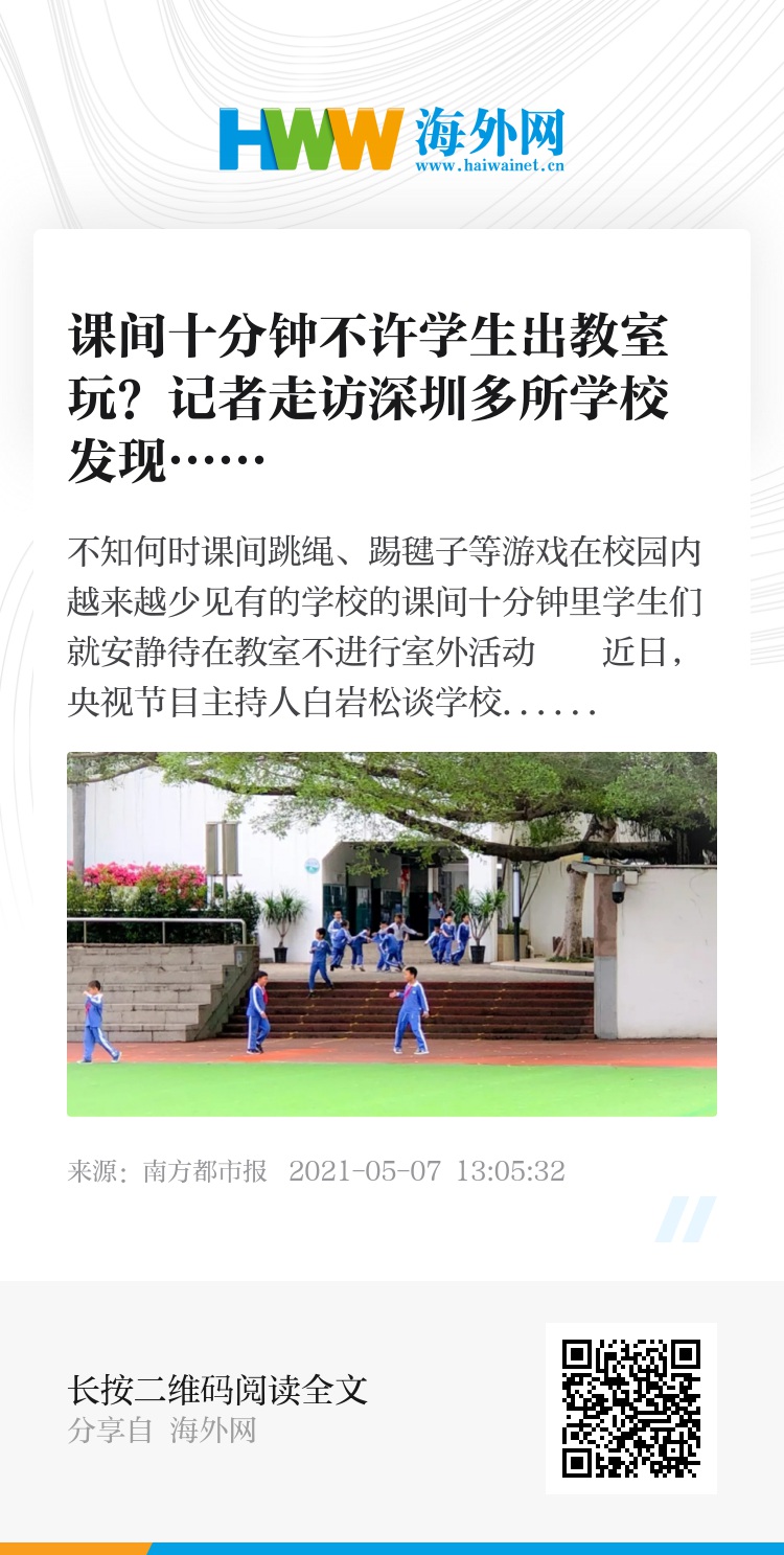 随后,记者来到了深圳明德实验学校碧海校区。“下课了,老师就让我们全都出去玩。”该校四年级学生刘同学说,他们偶尔会遇到老师拖课,但基本上都可以准时下课,下课后老师也会主动要求学生注意劳逸结合,多多出去活动。