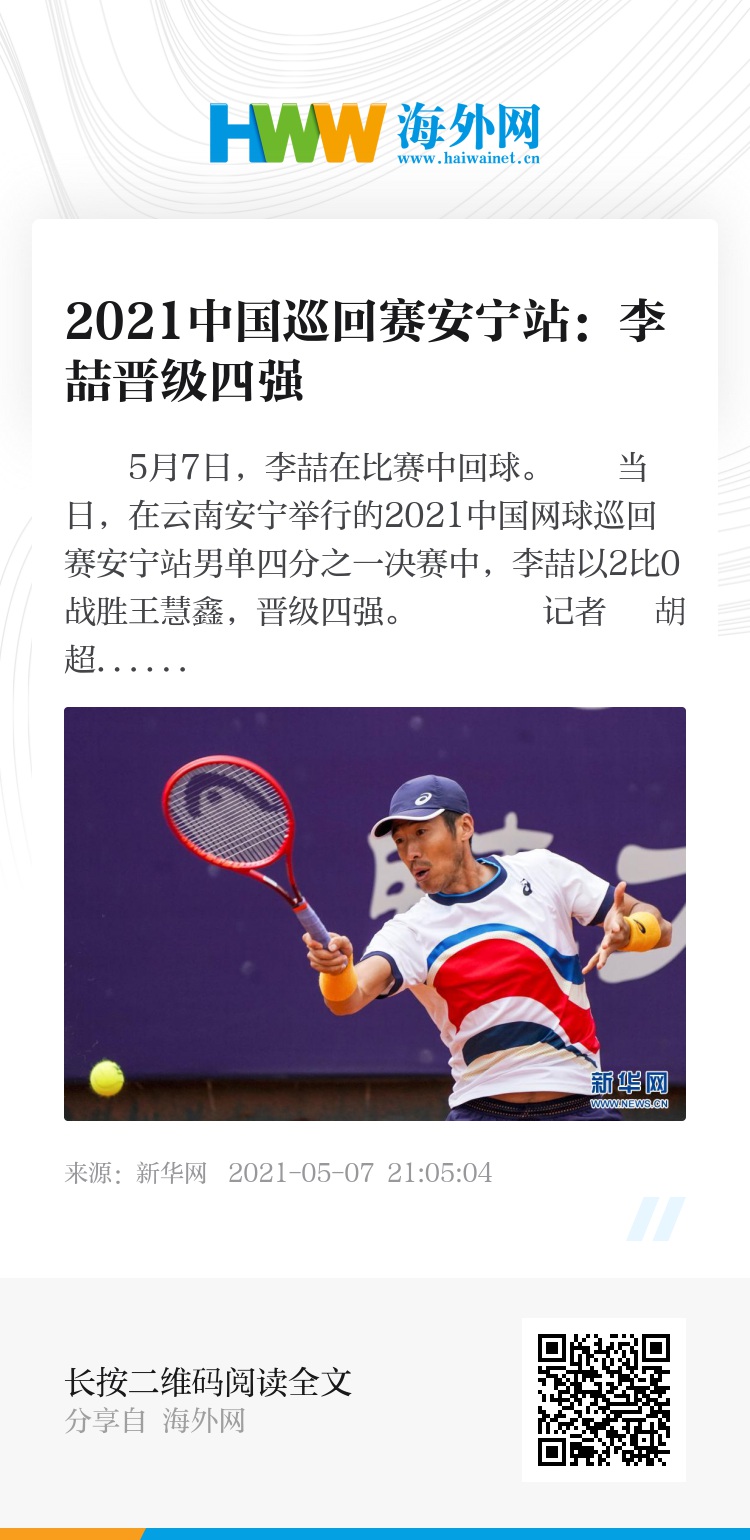 当日,在云南安宁举行的2021中国网球巡回赛安宁站男单四分之一决赛中,李喆以2比0战胜王慧鑫,晋级四强。