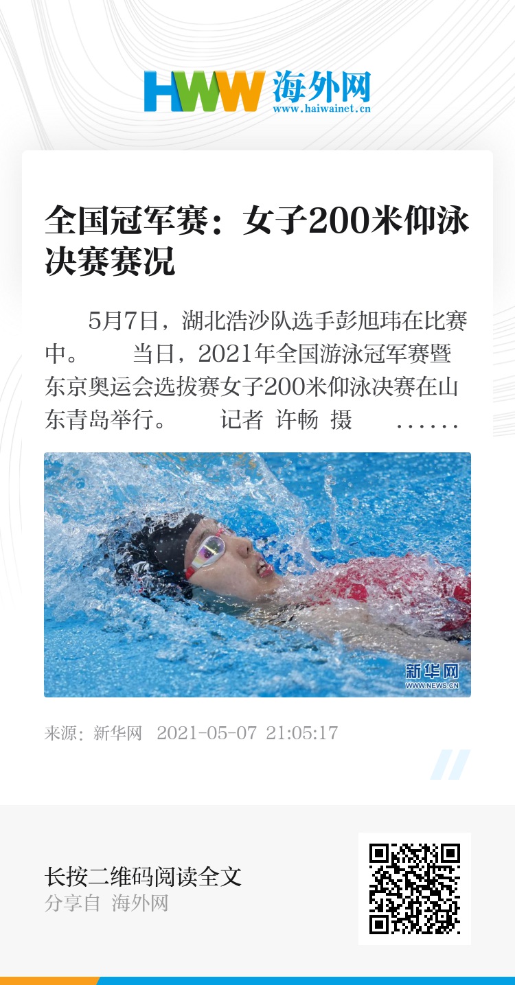 当日,2021年全国游泳冠军赛暨东京奥运会选拔赛女子200米仰泳决赛在山东青岛举行。