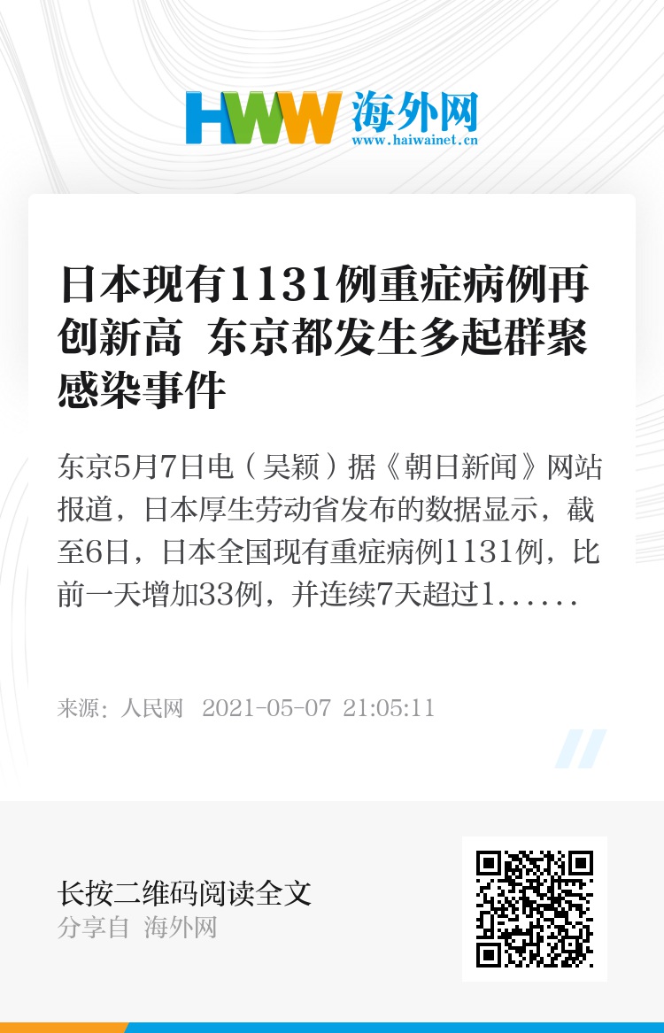 人民网东京5月7日电(吴颖)据《朝日新闻》网站报道,日本厚生劳动省发布的数据显示,截至6日,日本全国现有重症病例1131例,比前一天增加33例,并连续7天超过1000例,刷新最高记录。