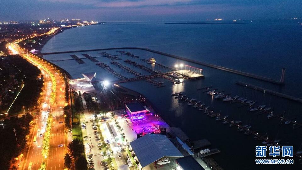 这是夜色下的海口国家帆船基地公共码头(5月4日摄,无人机照片)。新华社记者 杨冠宇 摄