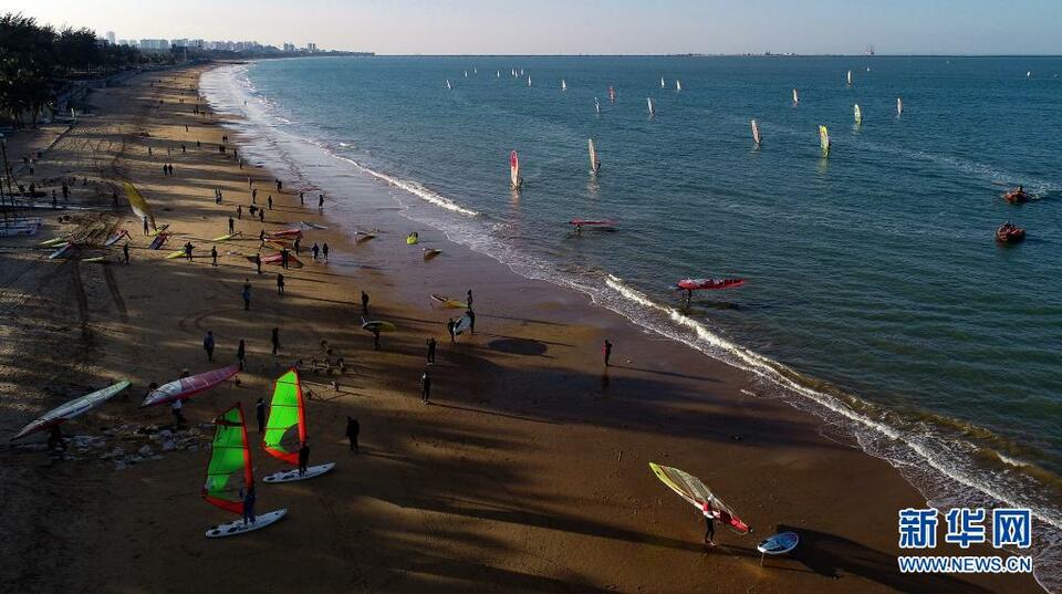 帆船帆板队选手在海口海滨冬训(1月12日摄,无人机照片)。新华社记者 郭程 摄