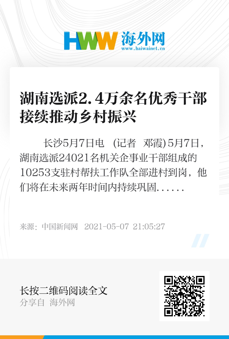 中新网长沙5月7日电 (记者 邓霞)5月7日,湖南选派24021名机关企事业干部组成的10253支驻村帮扶工作队全部进村到岗,他们将在未来两年时间内持续巩固拓展脱贫攻坚成果,接续推动乡村全面振兴。