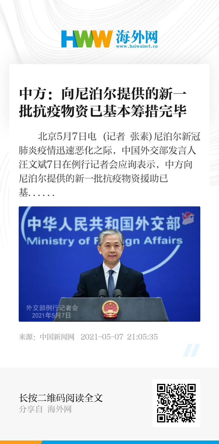 中新网北京5月7日电 (记者 张素)尼泊尔新冠肺炎疫情迅速恶化之际,中国外交部发言人汪文斌7日在例行记者会应询表示,中方向尼泊尔提供的新一批抗疫物资援助已基本筹措完毕,将尽快送到尼泊尔朋友手中。