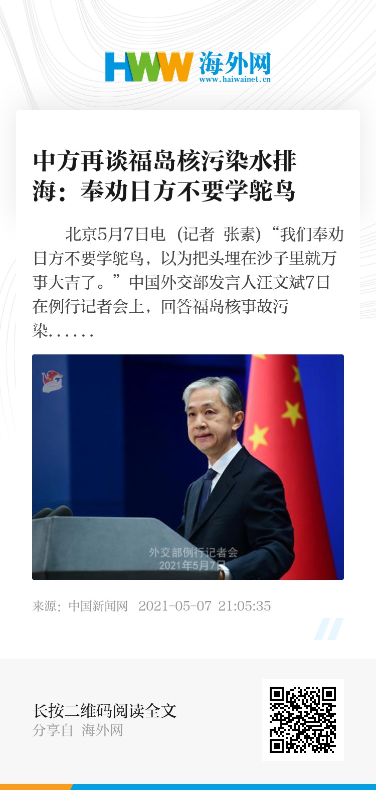 中新网北京5月7日电 (记者 张素)“我们奉劝日方不要学鸵鸟,以为把头埋在沙子里就万事大吉了。”中国外交部发言人汪文斌7日在例行记者会上,回答福岛核事故污染水排海问题时如是说。