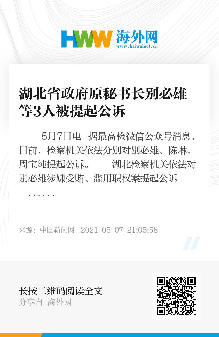 中新网5月7日电 据最高检微信公众号消息,日前,检察机关依法分别对别必雄、陈琳、周宝纯提起公诉。
