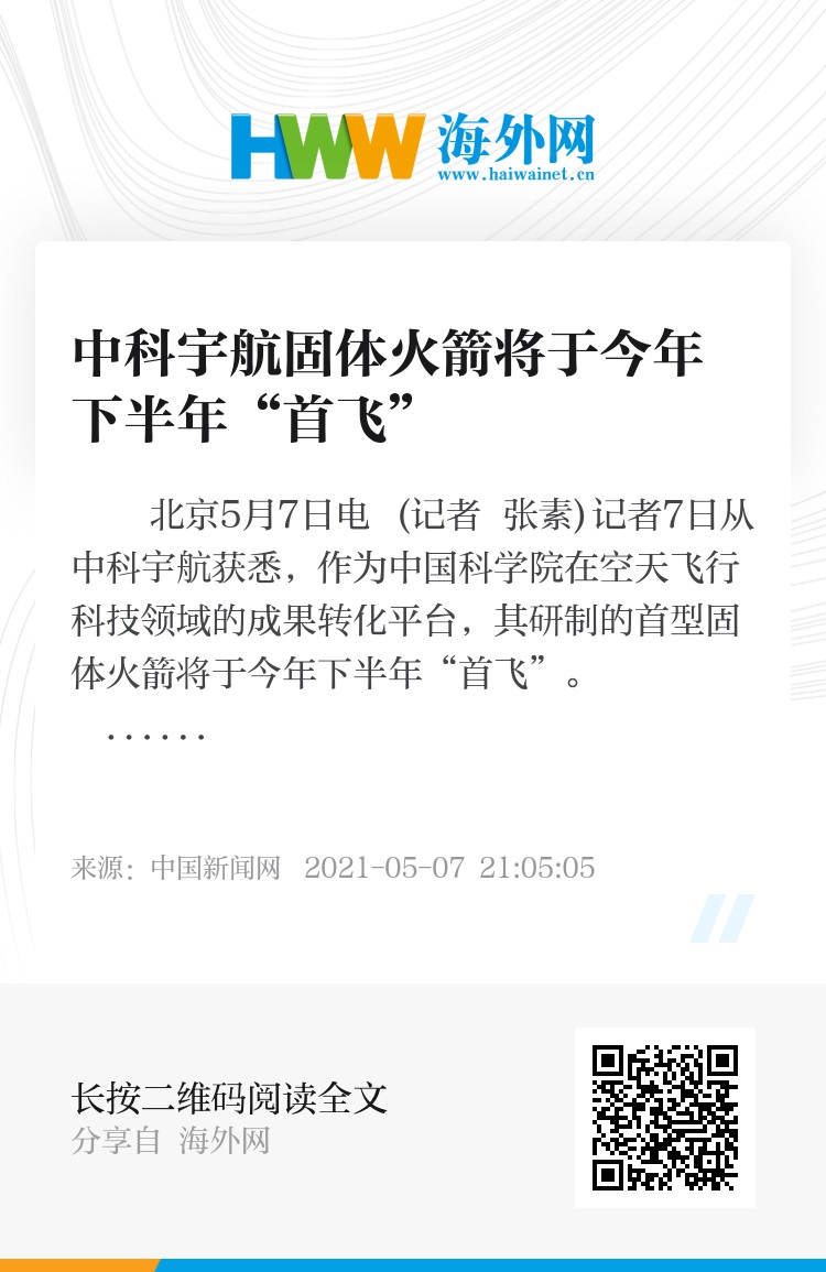 中新网北京5月7日电 (记者 张素)记者7日从中科宇航获悉,作为中国科学院在空天飞行科技领域的成果转化平台,其研制的首型固体火箭将于今年下半年“首飞”。