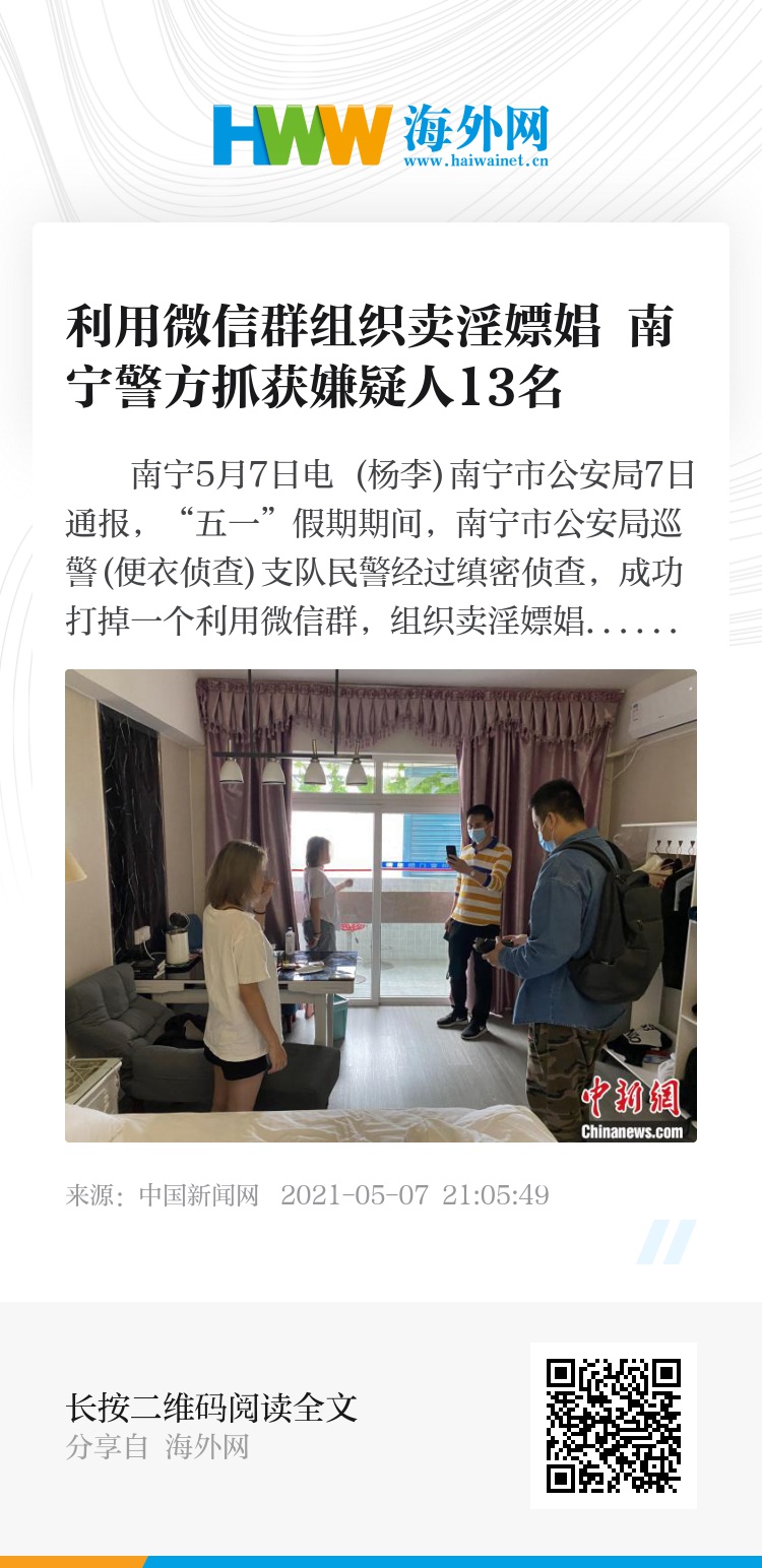 中新网南宁5月7日电 (杨李)南宁市公安局7日通报,“五一”假期期间,南宁市公安局巡警(便衣侦查)支队民警经过缜密侦查,成功打掉一个利用微信群,组织卖淫嫖娼的违法团伙,共抓获违法人员13人,其中组织卖淫人员1人,涉嫌卖淫嫖娼违法人员12人。