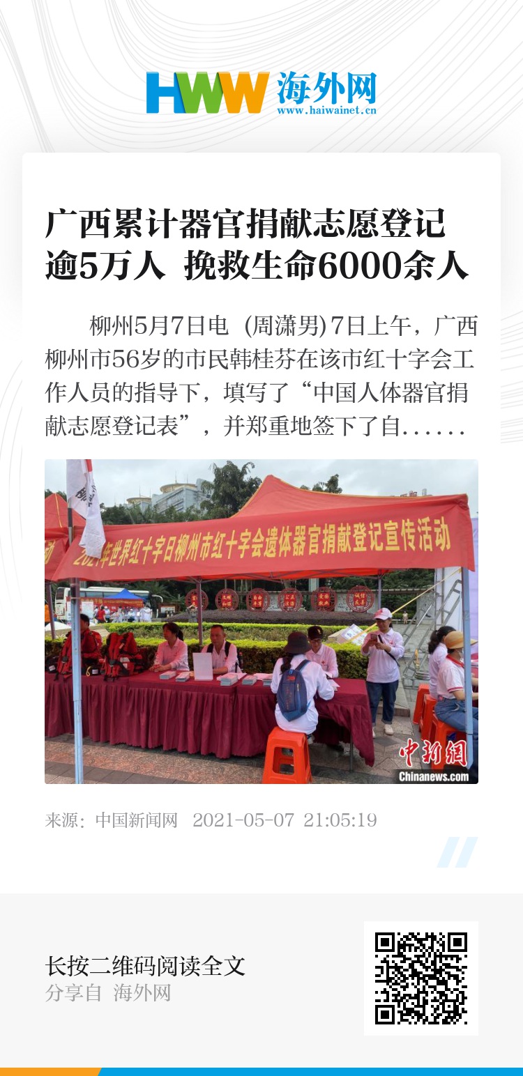 韩桂芬的举动只是广西积极推动人体器官捐献事业发展的一个缩影。据统计,广西累计器官捐献志愿登记5万多人,完成公民逝世后器官捐献2000余人,捐献的器官挽救了6000余人的生命。