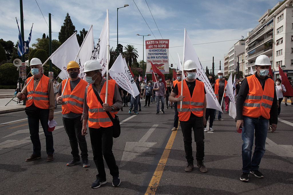 当地时间5月6日,希腊400多个来自公共机构和私营部门的工会组织在雅典联合举行罢工和示威游行。此次罢工和游行旨在庆祝刚刚过去的“五一劳动节”,并抗议内阁新近提交议会的劳工法案,呼吁维护和扩大普通劳动者的权益。图片来源:人民视觉