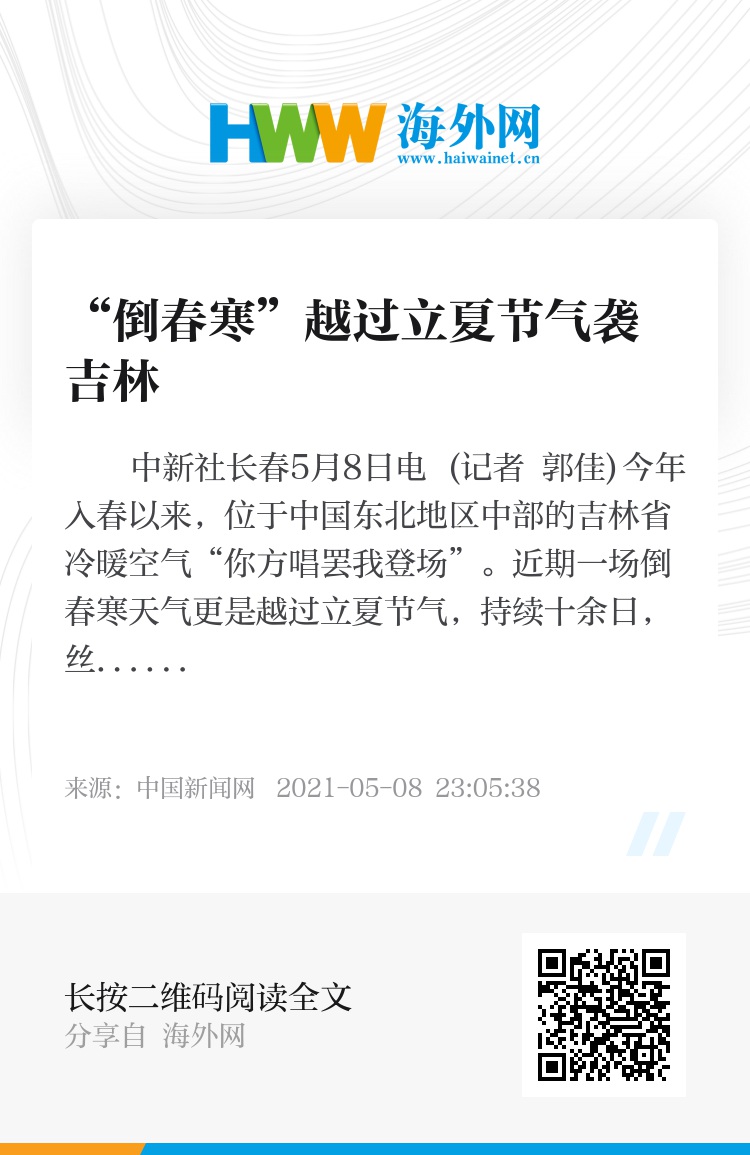 中新社长春5月8日电 (记者 郭佳)今年入春以来,位于中国东北地区中部的吉林省冷暖空气“你方唱罢我登场”。近期一场倒春寒天气更是越过立夏节气,持续十余日,丝毫不买夏天的账。