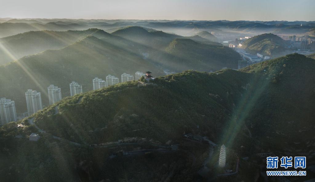 这是2019年8月29日拍摄的被绿色环绕的陕西省延安市宝塔山(无人机照片)。