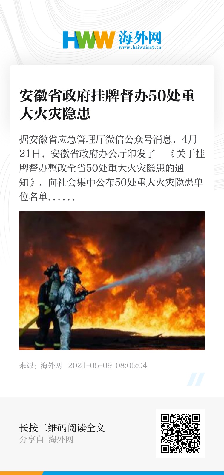 据安徽省应急管理厅微信公众号消息,4月21日,安徽省政府办公厅印发了 《关于挂牌督办整改全省50处重大火灾隐患的通知》,向社会集中公布50处重大火灾隐患单位名单。这是自2008年以来,连续第14年由省政府挂牌督办重大火灾隐患。通知要求,各地、各有关部门要充分认识当前复杂严峻的消防安全形势,深刻汲取池州市贵池区铜锣湾商场“4·6”较大火灾事故教训,加强火灾事故隐患排查治理,有效防范重大火灾风险,切实维护人民群众生命和财产安全。