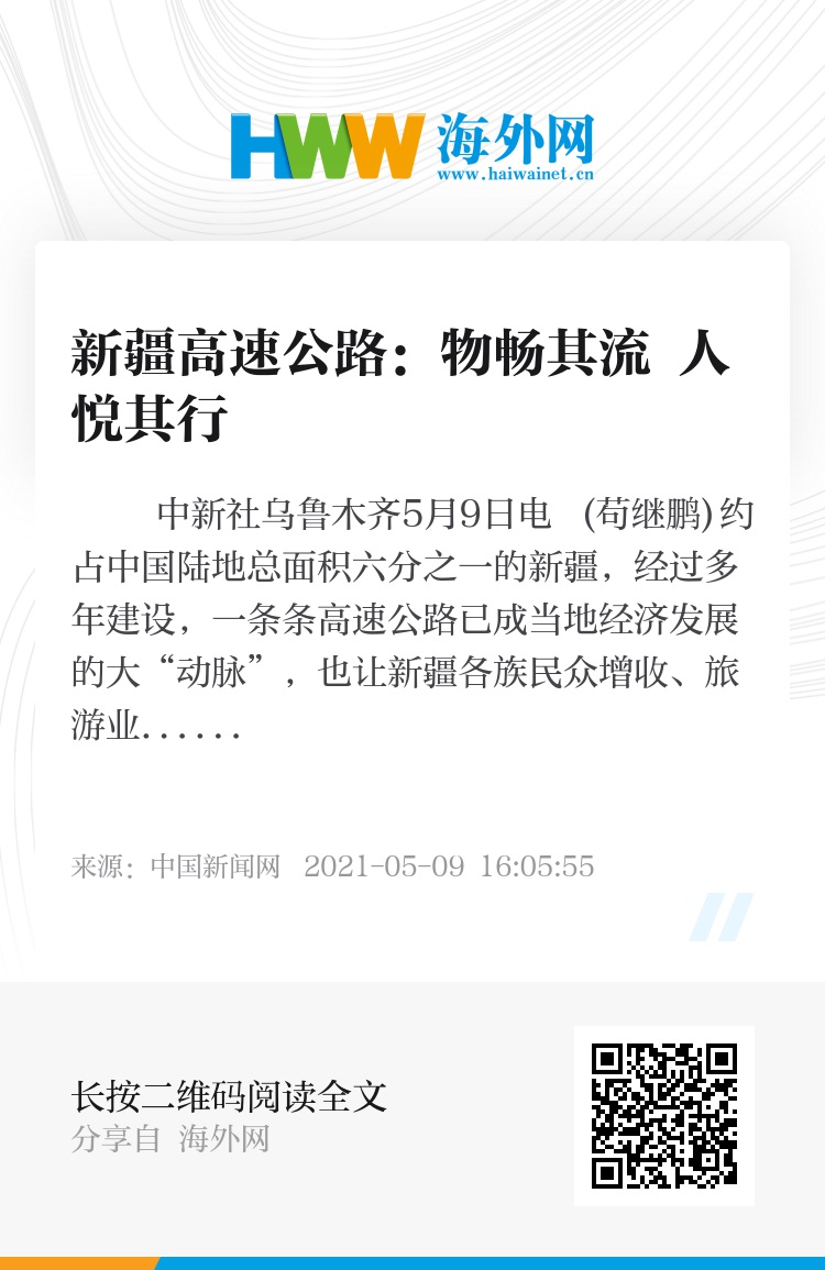中新社乌鲁木齐5月9日电 (苟继鹏)约占中国陆地总面积六分之一的新疆,经过多年建设,一条条高速公路已成当地经济发展的大“动脉”,也让新疆各族民众增收、旅游业发展走上了“高速通道”。