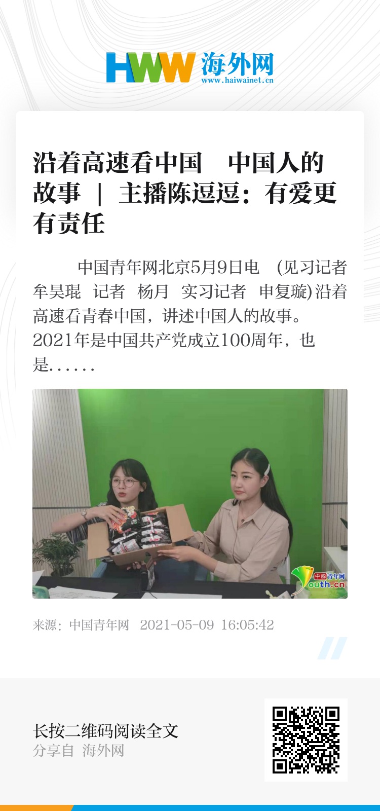 中国青年网北京5月9日电 (见习记者 牟昊琨 记者 杨月 实习记者 申复璇)沿着高速看青春中国,讲述中国人的故事。2021年是中国共产党成立100周年,也是“两个一百年”奋斗目标交汇之年,近日,由中国青年报社主办,中国青年网承办,快手、快手乡村、盘石集团、东方美谷奉贤新城、膳蔻凯普斯协办的“沿着高速看中国・中国人的故事”第三场直播活动走进上海市奉贤区。上海既是中国共产党初心的发源地,也是改革开放的热土。100年间,一代代年轻人书写着他们的故事。当下的故事又是怎样?来直播中寻找答案!