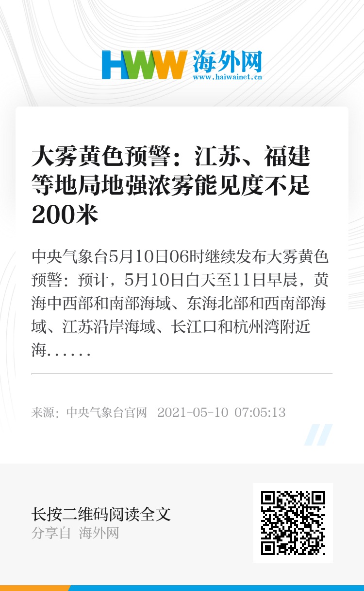 预计,5月10日白天至11日早晨,黄海中西部和南部海域、东海北部和西南部海域、江苏沿岸海域、长江口和杭州湾附近海域、浙江沿岸海域、福建北部沿岸海域将有能见度不足1公里的大雾。此外,10日早晨至上午,江苏北部、福建西部等地的部分地区有大雾,局地有能见度不足200米的强浓雾。