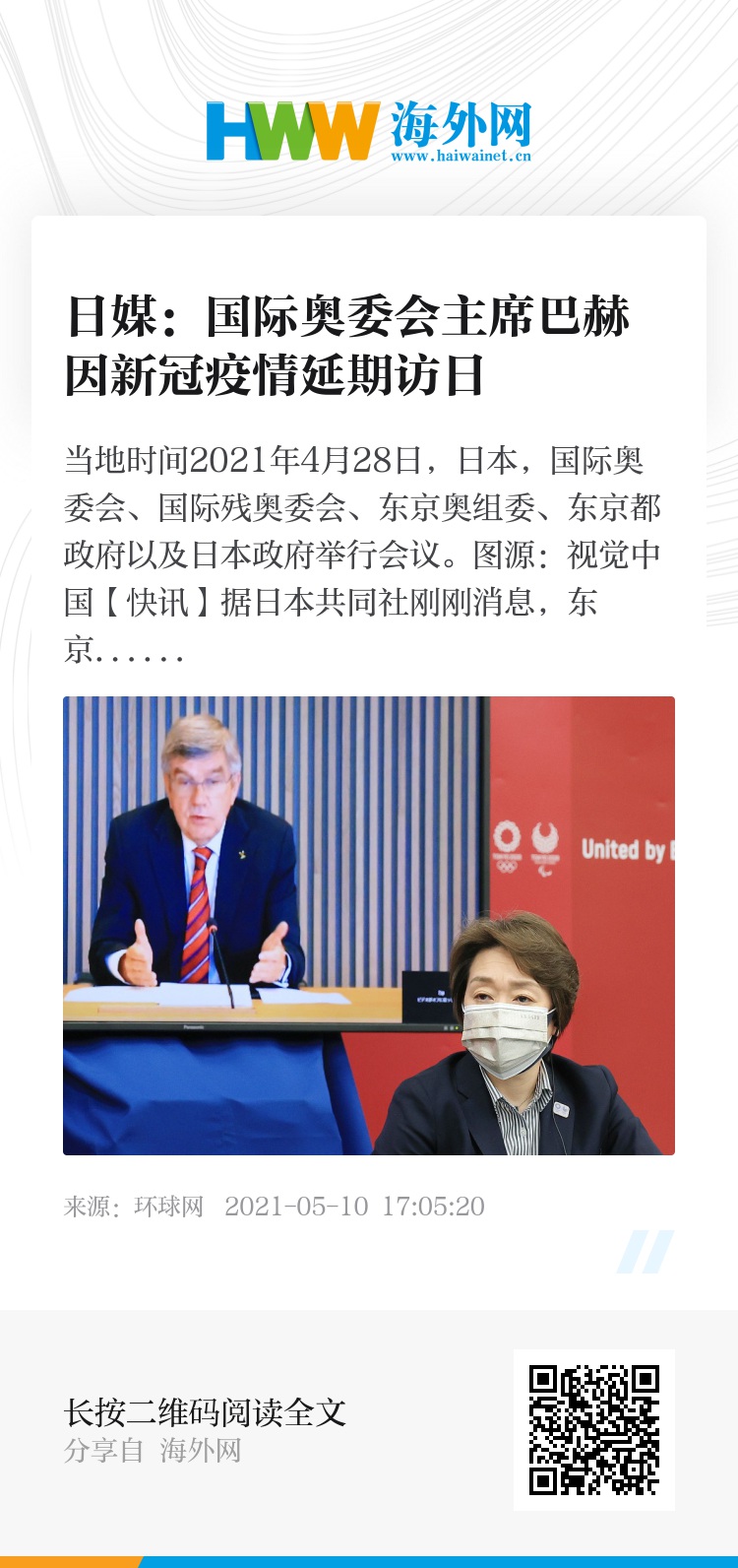 【环球网快讯】据日本共同社刚刚消息,东京奥运会和残奥会组织委员会10日宣布,鉴于新冠疫情,国际奥委会主席巴赫原定5月访问日本的日程延期。