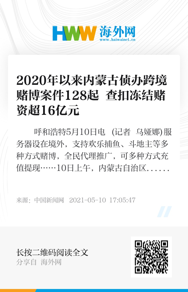 中新网呼和浩特5月10日电 (记者 乌娅娜)服务器设在境外,支持欢乐捕鱼、斗地主等多种方式赌博,全民代理推广,可多种方式充值提现……10日上午,内蒙古自治区公安厅发布了2020年以来打击治理跨境赌博工作的相关情况,内蒙古公安机关共侦办跨境赌博案件128起,查扣冻结涉赌资金16亿余元(人民币,下同)。