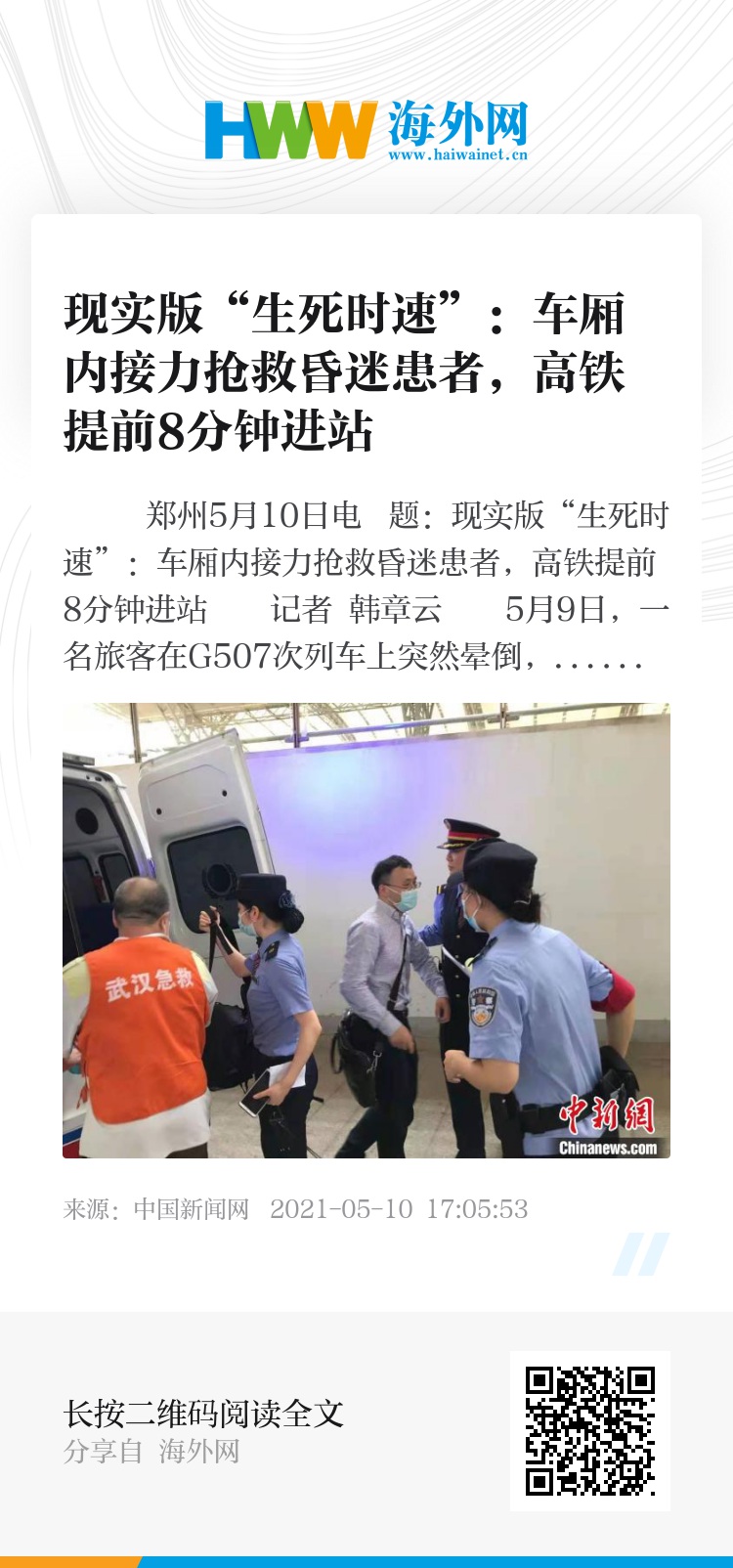 中新网郑州5月10日电 题:现实版“生死时速”:车厢内接力抢救昏迷患者,高铁提前8分钟进站